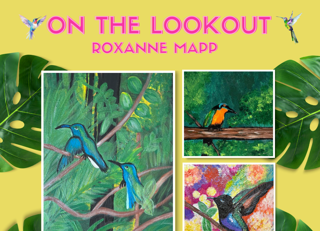 Her solo exhibit, “On The Lookout” celebrates hummingbirds and nature, inspired by her time in Tobago. It invites viewers to experience the beauty and symbolism of her vivid, detailed artwork.